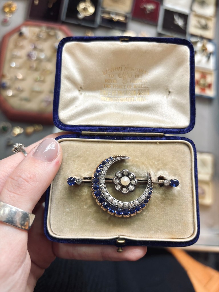 There were brooches everywhere, each one more intricate than the last. One that really caught my eye was a crescent-shaped brooch set with sapphires. It could have gone into a museum collection, easily!