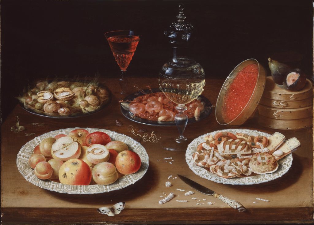 Banquet still lifes, however, were not straightforward records of consumption. Works such as Osias Beert’s Stilleven met vruchten, koekjes, spanen dozen en glaswerk combine abundance with subtle moral cues. Plates of nuts, dried fruits, biscuits, and sugar candy are paired with fragile glassware, a fly on a cut apple, and a butterfly perched at the table’s edge. These details introduce themes of decay, transformation, and impermanence, framing sweetness as both pleasurable and fleeting.